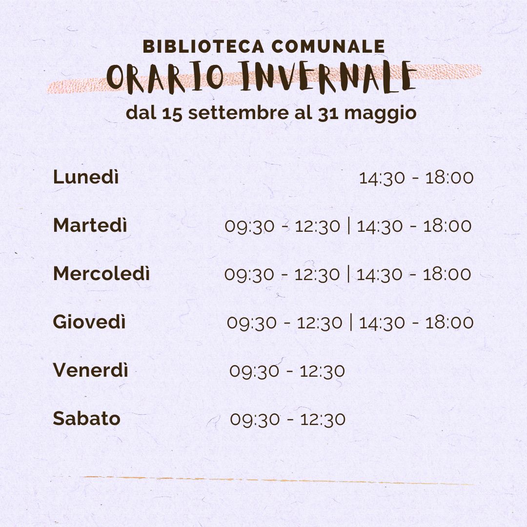 Si ricorda alla cittadinanza che da lunedì 15 settembre il servizio di Biblioteca sarà aperto con l'orario invernale, come da prospetto.