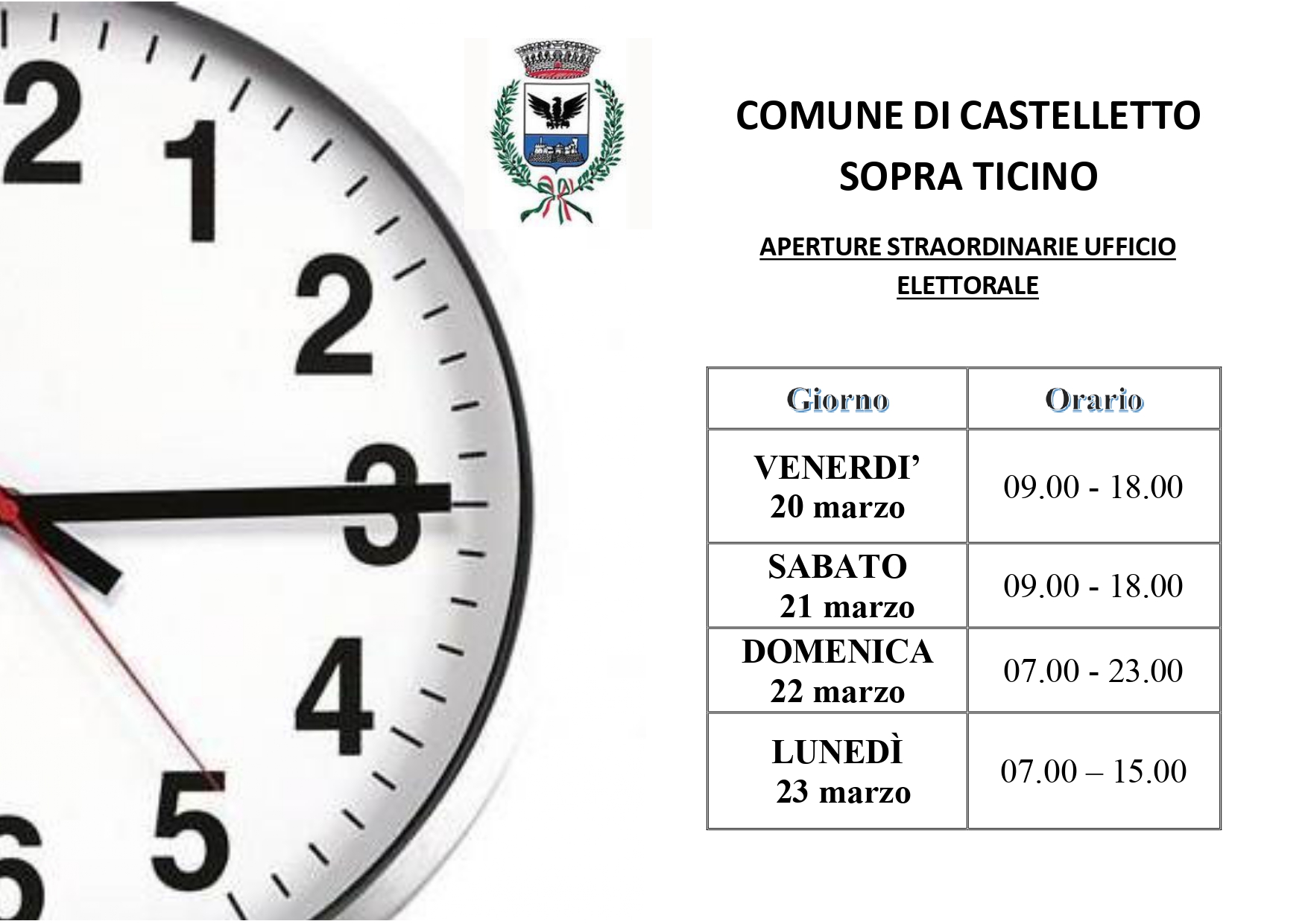 Si comunicano gli orari di apertura straordinaria in occasione dei Referendum 2026