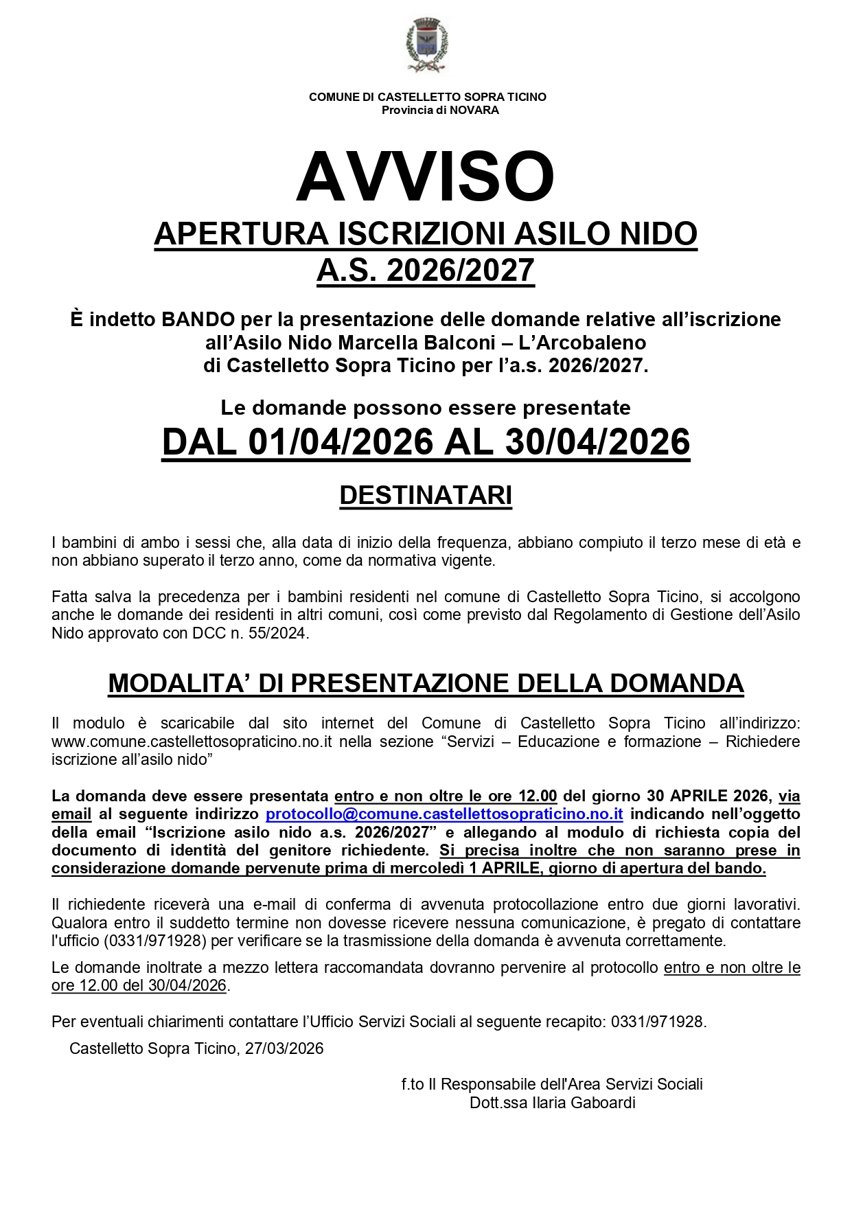 La domanda deve essere presentata entro e non oltre le ore 12.00 del giorno 30 APRILE 2026, via email al seguente indirizzo protocollo@comune.castellettosopraticino.no.it indicando nell’oggetto della email “Iscrizione asilo nido a.s. 2026/2027” e allegando al modulo di richiesta copia del documento di identità del genitore richiedente. Si precisa inoltre che non saranno prese in considerazione domande pervenute prima di mercoledì 1 APRILE, giorno di apertura del bando.