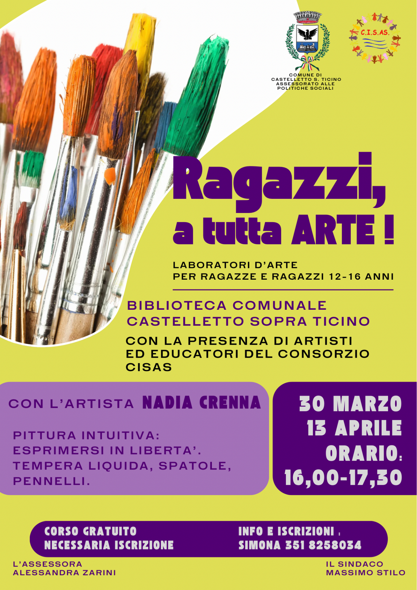 Nelle giornate del 30 marzo e del 13 aprile dalle ore 16.00 alle ore 17,30 si terranno, presso la Biblioteca Comunale di Castelletto Sopra Ticino, due laboratori d'arte per ragazze e ragazzi di età compresa tra i 12 e i 16 anni sul tema della pittura intuitiva.