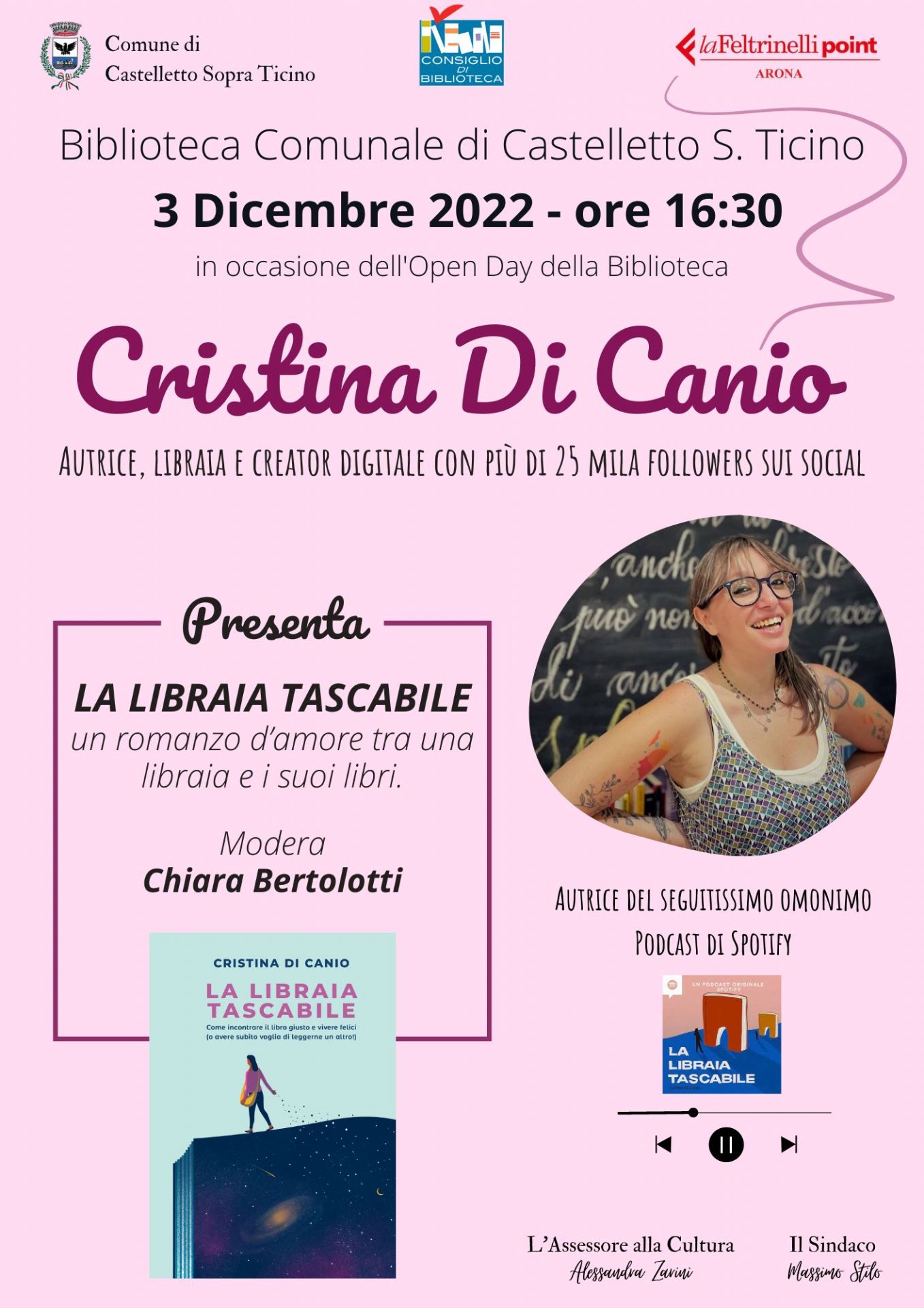 Sabato 3 dicembre alle 16.30, grazie alla collaborazione con la Feltrinelli point di Arona, presso la Biblioteca comunale, in occasione del tradizionale Open Day, sarà presente la libraia, autrice e "spacciatrice di sogni" Cristina di Canio per presentare il suo ultimo libro "La libraia tascabile".