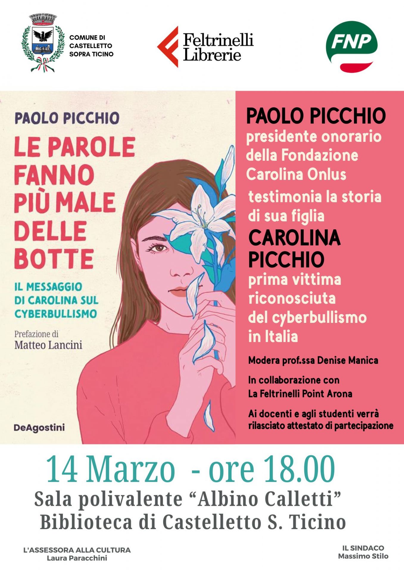 Durante l’incontro, organizzato in collaborazione con FNP e la libreria La Feltrinelli Point di Arona, e moderato dalla prof.ssa Denise Manica, Paolo Picchio presenterà il suo libro “Le parole fanno più male delle botte. Il messaggio di Carolina sul cyberbullismo”, in cui racconta la storia della figlia Carolina, morta suicida a 14 anni dopo la diffusione online di un video contro la sua volontà. La sua denuncia, prima del tragico epilogo, portò il Tribunale dei Minorenni di Torino a celebrare il primo processo per cyberbullismo in Italia.