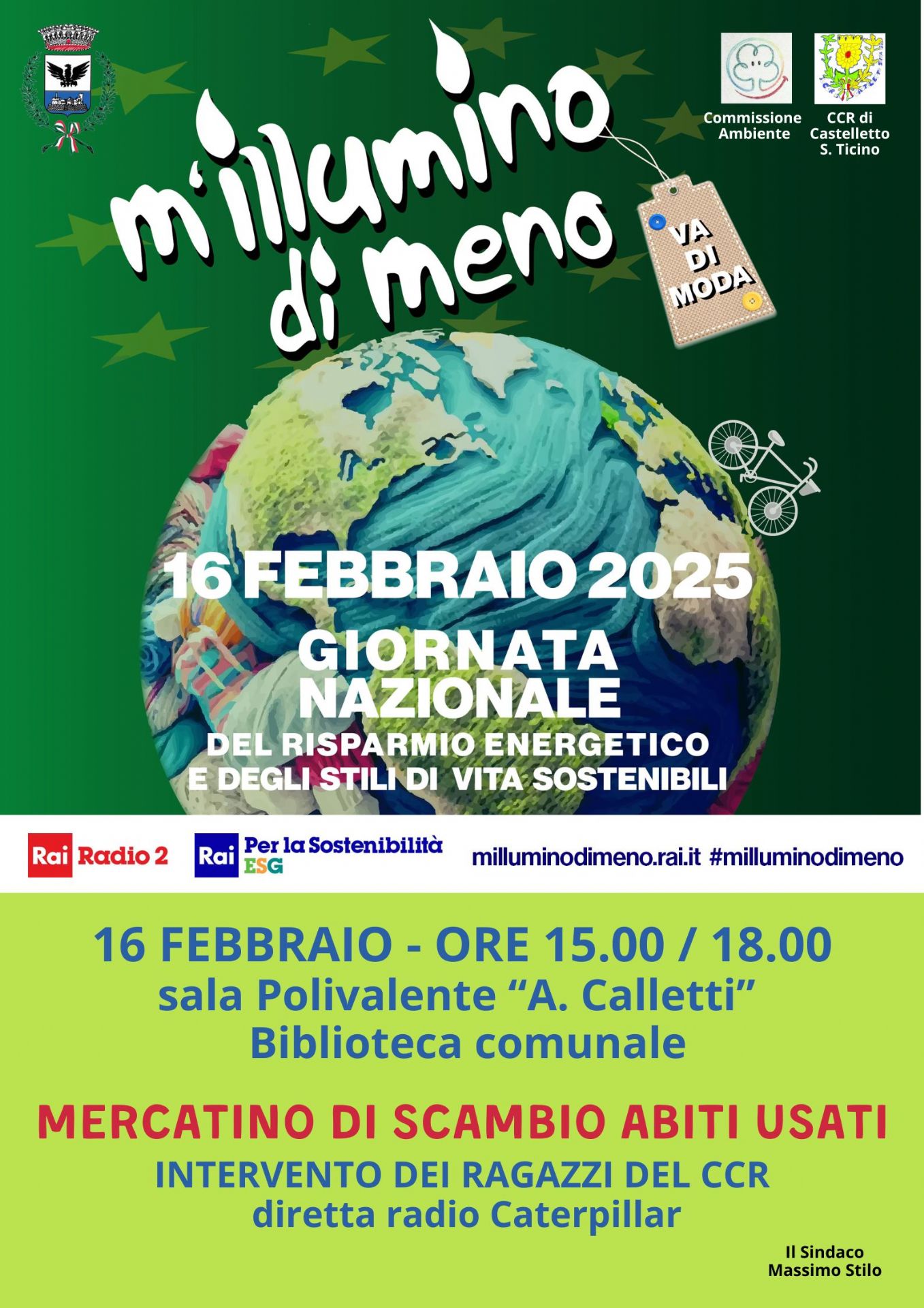 “M’illumino di Meno” è la Giornata Nazionale del Risparmio Energetico e degli Stili di Vita Sostenibili ideata nel 2005 da Rai Radio2 con la trasmissione Caterpillar e istituita dal Parlamento con la Legge n. 34/2022; si celebra ogni anno il 16 febbraio per diffondere la cultura della sostenibilità ambientale e del risparmio delle risorse.
