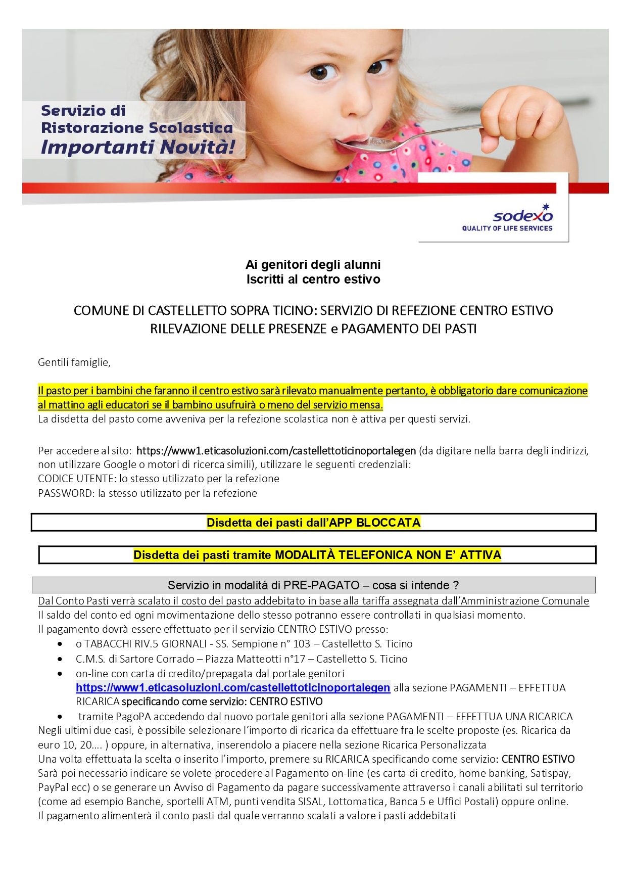 Informativa relativa al servizio mensa per i bambini iscritti al Centro Estivo Comunale 2024 : rilevazione presenze e pagamento pasti