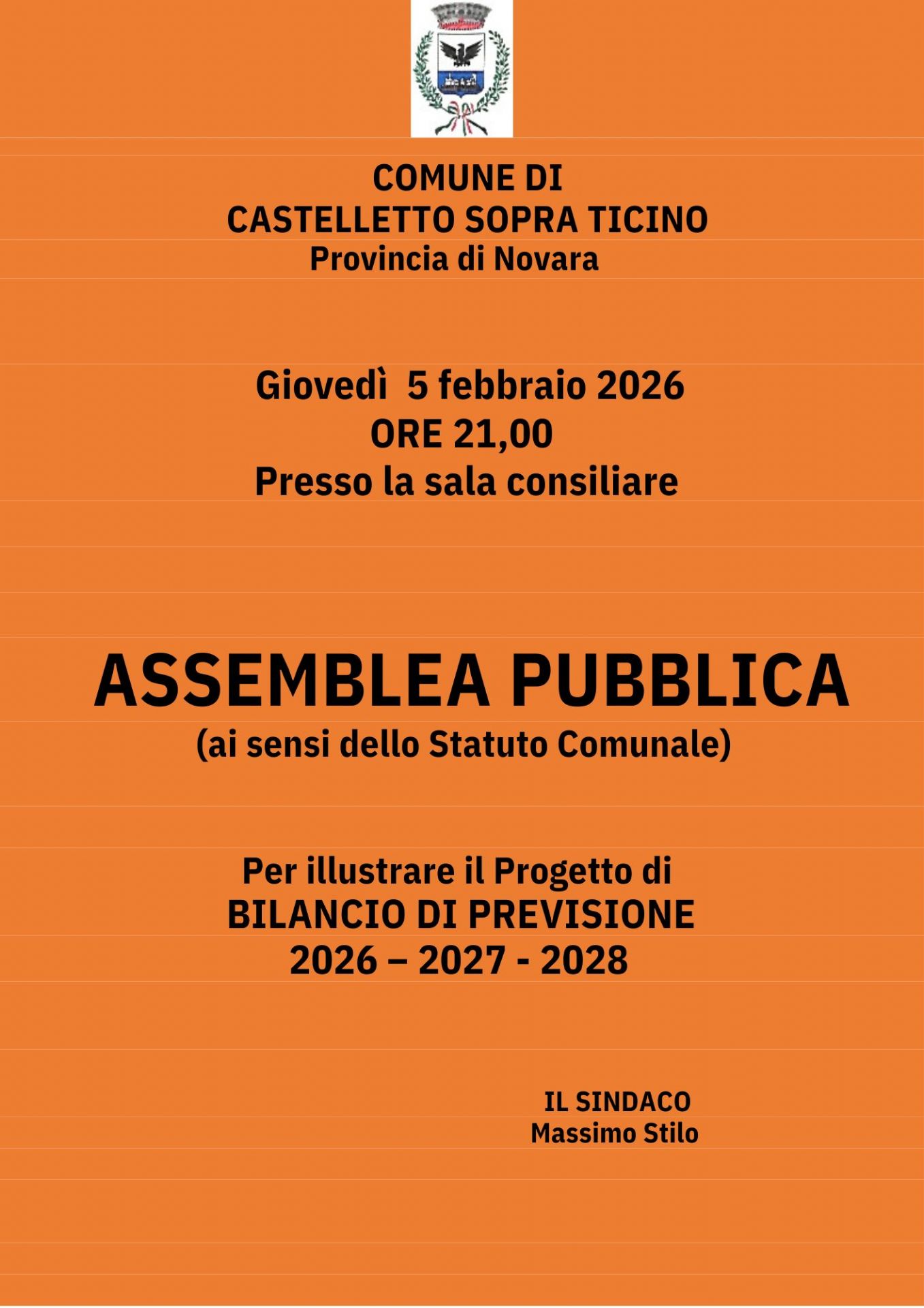 Si comunica che il giorno 5 febbraio 2026 alle ore 21.00 presso la Sala Consiliare del Comune di Castelletto Sopra Ticino è convocata l' Assemblea Pubblica per illustrare il progetto di Bilancio di Previsione 2026 - 2027 - 2028.