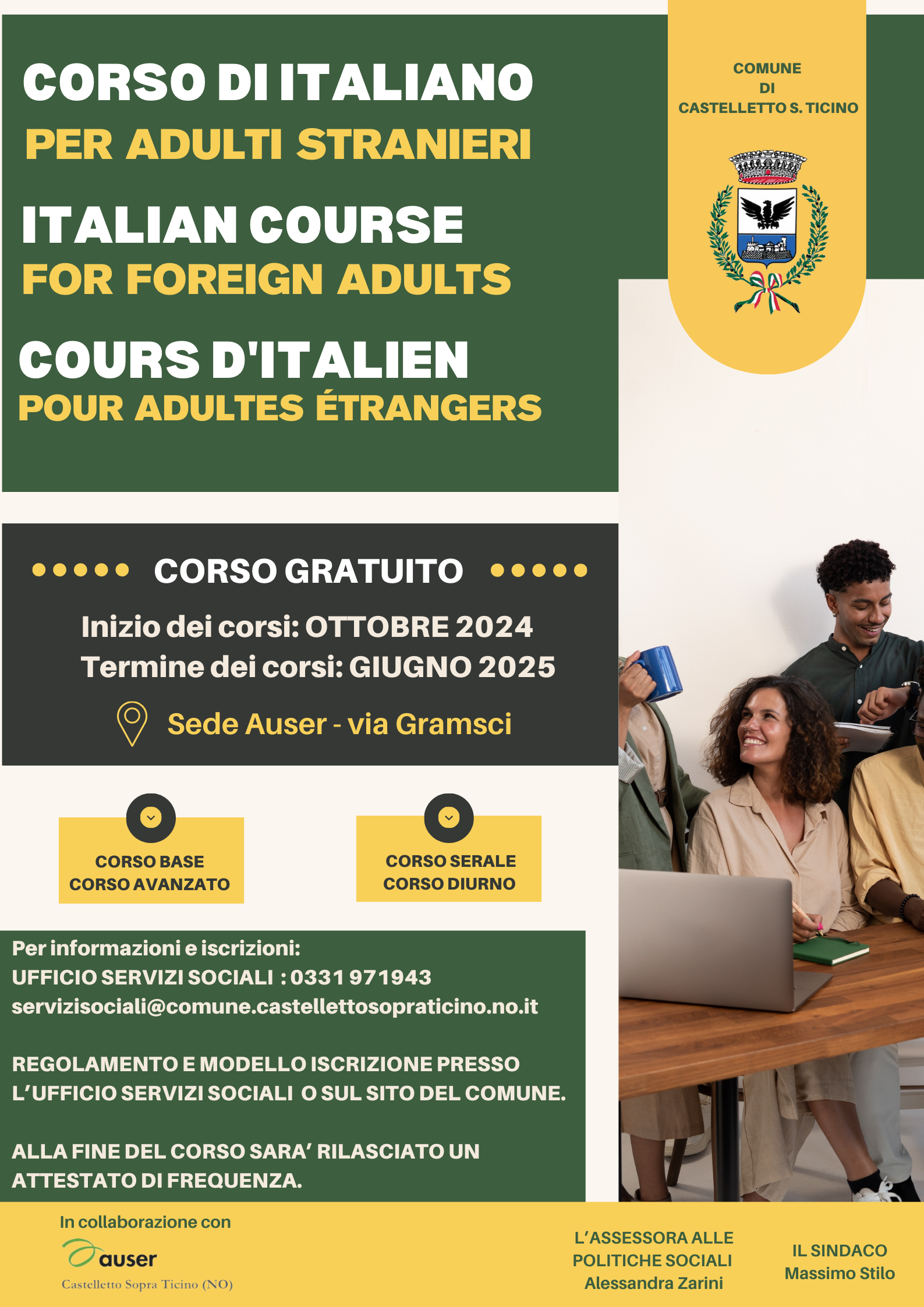 Possono usufruire del Corso di italiano per stranieri i cittadini maggiorenni, senza distinzione di genere, residenti nel Comune di Castelletto Sopra Ticino o nell’ambito territoriale del Consorzio C.I.S.AS. che siano intenzionati ad approfondire e a potenziare l’utilizzo della lingua italiana. Le iscrizioni di persone senza i requisiti suddetti ma segnalate dal Consorzio C.I.S.AS. saranno valutate singolarmente dai referenti del servizio e comunque accettate solo in caso di disponibilità di posti.