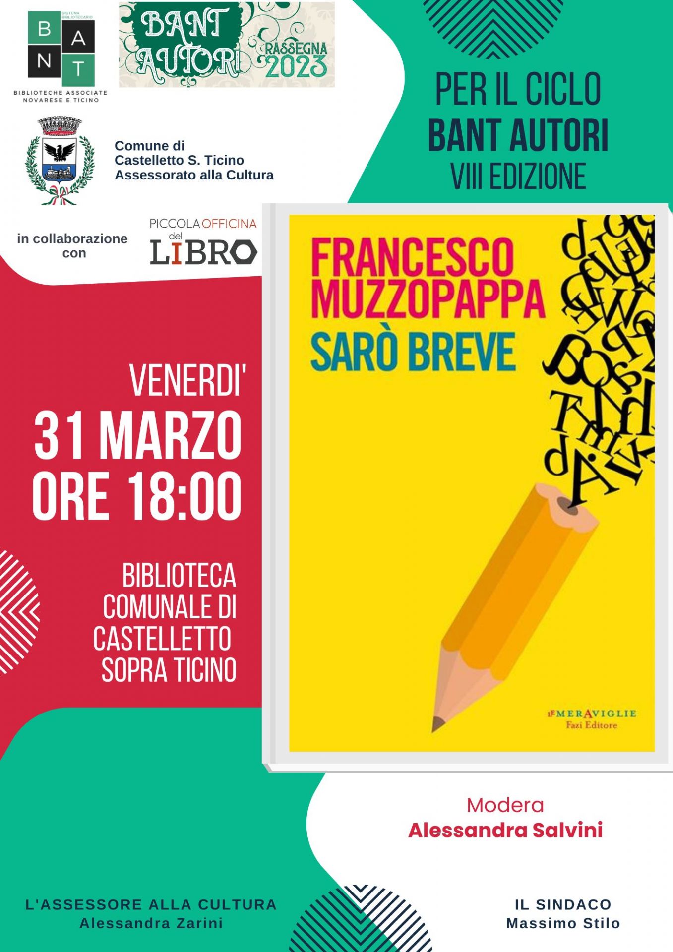 Venerdì 31 marzo alle ore 18:00 la Biblioteca di Casteletto ospita Francesco Muzzopappa che, insieme ad Alessandra Salvini, dialogherà sul romanzo Sarò breve edito da Fazi editore.