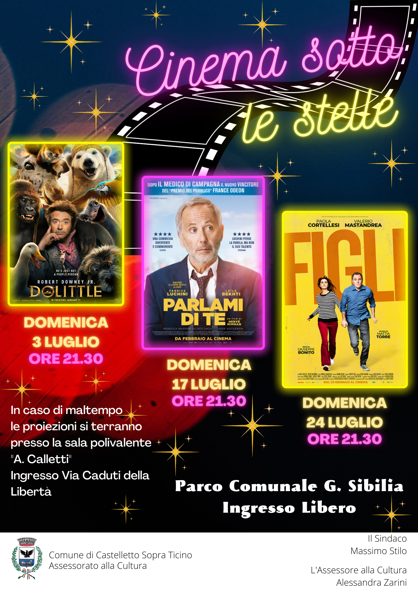 Le proiezioni, ad INGRESSO LIBERO, si terranno nel Parco comunale G. Sibilia di Castelletto Ticino; in caso di maltempo nella sala polivalente "A. Calletti" all'interno della biblioteca comunale.
